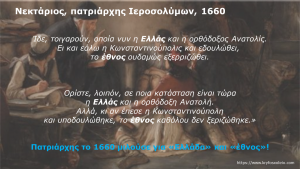 Κύριλλος Λούκαρης, Οικουμενικός Πατριάρχης. Γράφει σε επιστολή του απαντώντας στην κατηγορία «Λατίνων» σχετικά με την «έλλειψη σοφίας» των Ελλήνων, γύρω στο 1620. «Πως η ανατολική εκκλησία και όλον το γένος των Ελλήνων είναι κακά καταστρεμμένον, τούτο δεν το αρνούμεθα. […]…